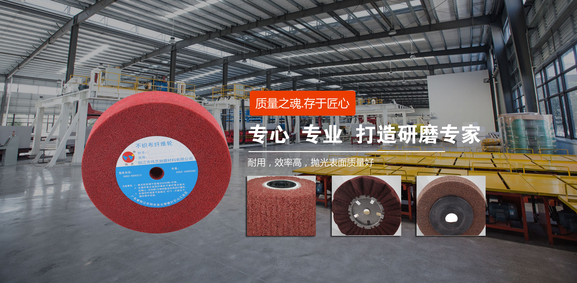 陽江市偉藝拋磨材料有限公司座落于中國刀剪之都——陽江市,具有近二十年尼龍輪生產和銷售經驗,生產基地占地面積4.6萬多平方米。偉藝公司立足自主研發,致力于產業化發展。現已研發、生產了尼龍輪、擦色輪、飛翼輪、拉絲輪、清潔拋、不織布刷輥、工業擦布、塑膠研磨石、金剛砂、噴膠棉等十多種應用于多種領域的研磨材料,并可以根據客戶的需求提供針對性解決方案和個性化服務。 偉藝公司致...